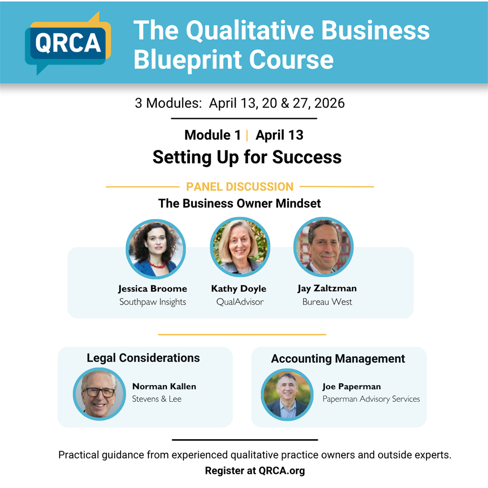 Designed for qualitative business owners at every stage — from newer independents to established consultancies — this course is designed to help qualitative professionals build, operate, and grow their practices with greater confidence.