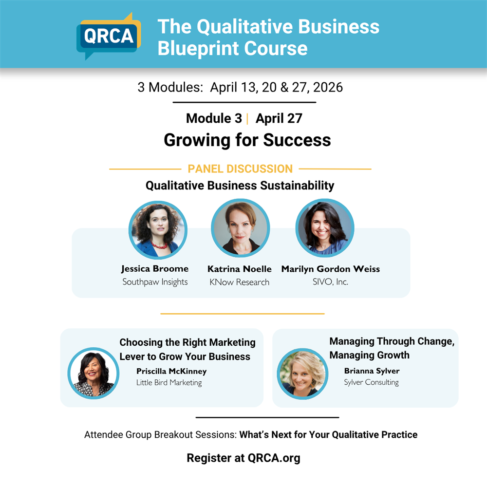 Designed for qualitative business owners at every stage — from newer independents to established consultancies — this course is designed to help qualitative professionals build, operate, and grow their practices with greater confidence.